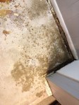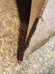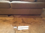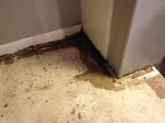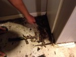 Just a couple of nights ago we were watching the late-night news, when one of us stepped down off the couch right into a puddle on the carpet. Our first reaction was to yell at the dog…. until we realized the puddle was growing. On its own. We began to pull up the carpet on that corner of the room, and what a horrible smelly mess awaited us. Dripping carpet, black mold, rotted tack-strips and base-molding – it was horrible and stunk to the high heavens! So THAT was the source of the musty smell that had been growing in the living room…!